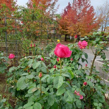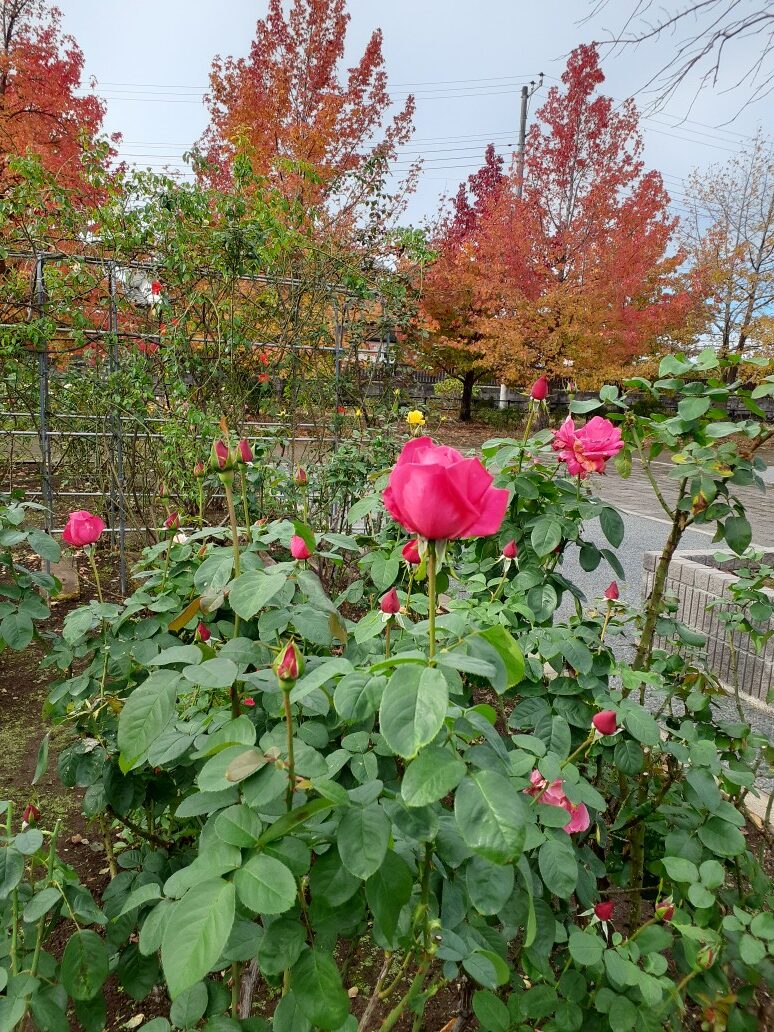 花久の里バラ園のようす(2025.11.2) 黄色が鮮やかです まだ、蕾が多くついています。(ハイブリットティ クイーンエリザベス) バラとバフウカエデ 今年のバフウカエデは色づきが良いです。 鮮やかなバフウカエデの並木道 今日は、朝から良い天気になりました。庭園のバラも気温が落ち着いてきましたのできれいに咲いています。今月、中旬ごろまで楽しめるます。また、気温が下がってきたことで長屋門前のバフウモミジが鮮やかに色づいてきました。今年は虫による食害も少なかったので鮮やかな紅葉が見られます。 写真をフォトギャラリーにアップしましたのでご覧ください。 フォトギャラリー名 花久の里バラ園のようす(2025.11.2)